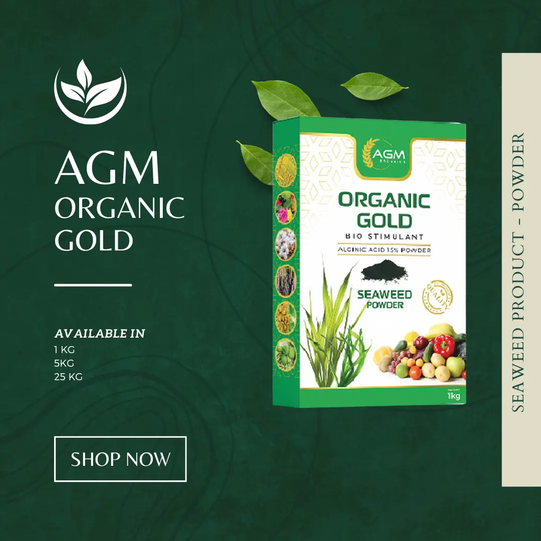 AGM ORGANIC GOLD is a powdered Seaweed extract product is receiving increasing attention as nutrient supplements in integrated crop nutritional programs. These products are currently applied to crops for beneficial effects attributed to the presence of natural plant growth hormones (i.e. cytokinins, auxins) as well as other plant biostimulants (e.g. betaines, polyamines, oligosaccharides) which can improve plant resistances and tolerances to environmental, disease and insect stresses.
